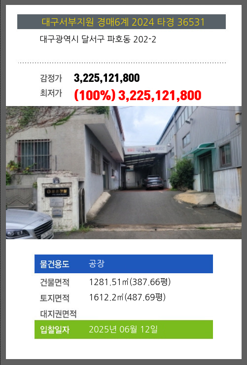 사건번호 2024 타경 36531 본건은 대구광역시 달서구 파호동 202-2소재하는 공장경매 물건의 포스팅입니다. 건물면적 [ 1281.51㎡ (387.66평) ]토지면적 [ 1612.2㎡ (487.69평) ] 시세를 반영한 감정가 3,225,121,800에서신건으로