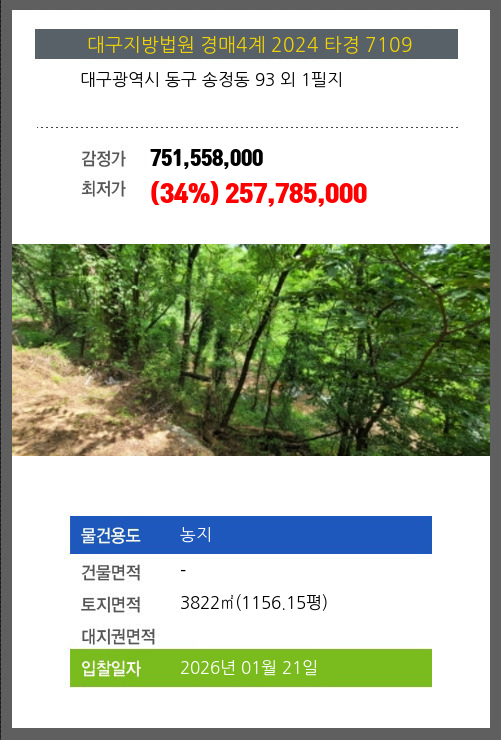 사건번호 2024 타경 7109 본건은 대구광역시 동구 송정동 93 외 1필지소재하는 농지경매 물건의 포스팅입니다. 토지면적 [ 3822㎡ (1156.15평) ] 시세를 반영한 감정가 751,558,000에서3회 유찰되어 감정가