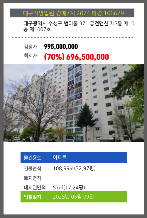 사건번호 2024 타경 106679 본건은 대구광역시 수성구 범어동 371 궁전맨션 제3동 제10층 제1007호소재하는 아파트경매 물건의 포스팅입니다. 건물면적 [ 108.99㎡ (32.97평) ]대지권 [ 57㎡ (17.24평) ]