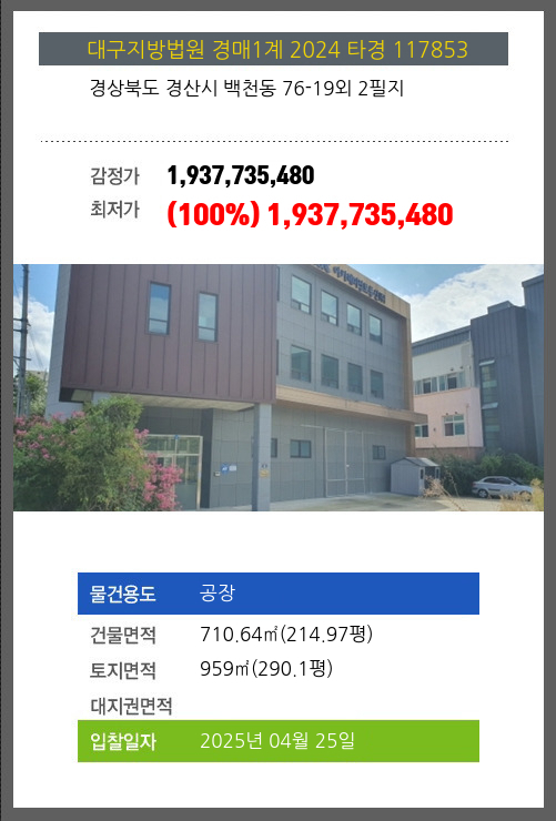 사건번호 2024 타경 117853 본건은 경상북도 경산시 백천동 76-19외 2필지소재하는 공장경매 물건의 포스팅입니다. 건물면적 [ 710.64㎡ (214.97평) ]토지면적 [ 959㎡ (290.1평) ] 시세를 반영한 감정가