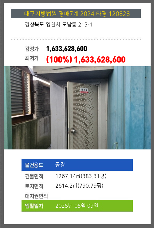 사건번호 2024 타경 120828 본건은 경상북도 영천시 도남동 213-1소재하는 공장경매 물건의 포스팅입니다. 건물면적 [ 1267.14㎡ (383.31평) ]토지면적 [ 2614.2㎡ (790.79평) ] 시세를 반영한 감정가 1,633,628,600에서신건으로