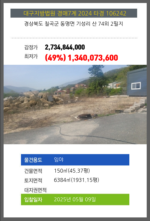 사건번호 2024 타경 106242 본건은 경상북도 칠곡군 동명면 기성리 산 74외 2필지소재하는 임야경매 물건의 포스팅입니다. 건물면적 [ 150㎡ (45.37평) ]토지면적 [ 6384㎡ (1931.15평) ] 시세를