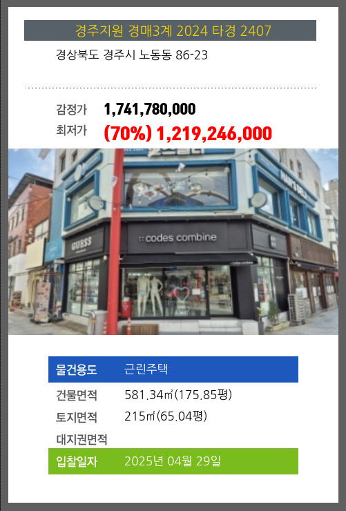 사건번호 2024 타경 2407 본건은 경상북도 경주시 노동동 86-23소재하는 근린주택경매 물건의 포스팅입니다. 건물면적 [ 581.34㎡ (175.85평) ]토지면적 [ 215㎡ (65.04평) ] 시세를 반영한 감정가 1,741,780,000에서1회