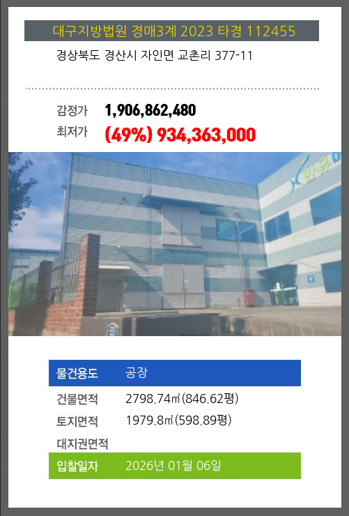 사건번호 2023 타경 112455 본건은 경상북도 경산시 자인면 교촌리 377-11소재하는 공장경매 물건의 포스팅입니다. 건물면적 [ 2798.74㎡ (846.62평) ]토지면적 [ 1979.8㎡ (598.89평) ] 시세를 반영한 감정가