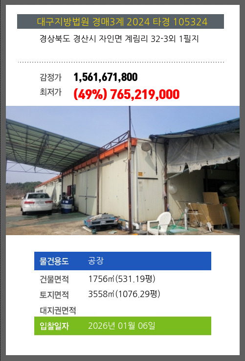 사건번호 2024 타경 105324 본건은 경상북도 경산시 자인면 계림리 32-3외 1필지소재하는 공장경매 물건의 포스팅입니다. 건물면적 [ 1756㎡ (531.19평) ]토지면적 [ 3558㎡ (1076.29평) ] 시세를 반영한