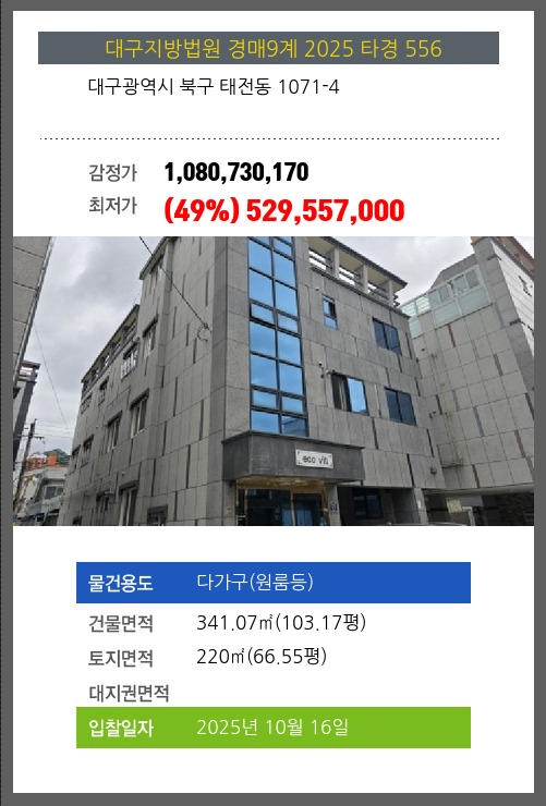 사건번호 2025 타경 556 본건은 대구광역시 북구 태전동 1071-4소재하는 다가구(원룸등)경매 물건의 포스팅입니다. 건물면적 [ 341.07㎡ (103.17평) ]토지면적 [ 220㎡ (66.55평) ] 시세를 반영한 감정가 1,080,730,170에서2회