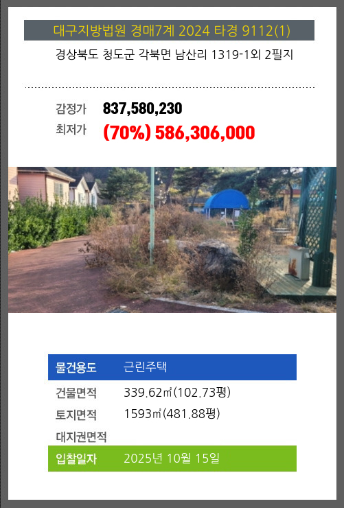 사건번호 2024 타경 9112(1) 본건은 경상북도 청도군 각북면 남산리 1319-1외 2필지소재하는 근린주택경매 물건의 포스팅입니다. 건물면적 [ 339.62㎡ (102.73평) ]토지면적 [ 1593㎡ (481.88평) ] 시세를 반영한