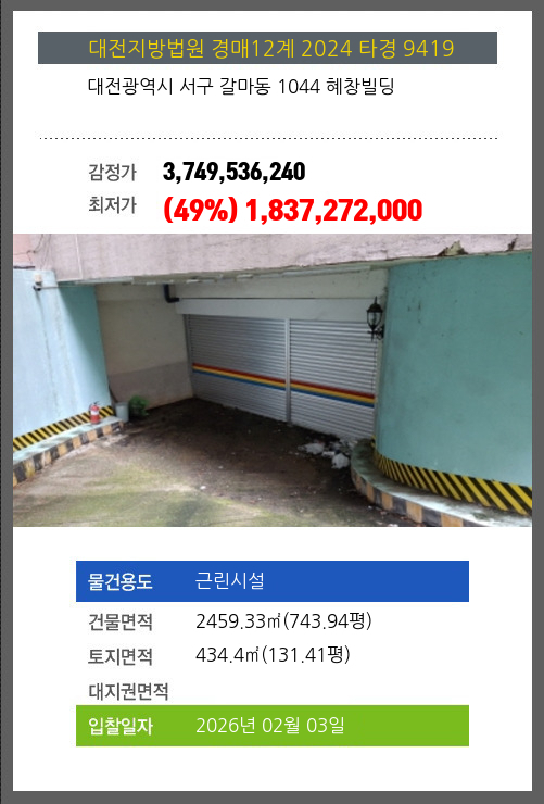 사건번호 2024 타경 9419 본건은 대전광역시 서구 갈마동 1044 혜창빌딩소재하는 근린시설경매 물건의 포스팅입니다. 건물면적 [ 2459.33㎡ (743.94평) ]토지면적 [ 434.4㎡ (131.41평) ] 시세를 반영한 감정가
