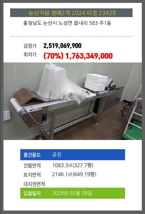 사건번호 2024 타경 23428 본건은 충청남도 논산시 노성면 읍내리 583 주1동소재하는 공장경매 물건의 포스팅입니다. 건물면적 [ 1083.3㎡ (327.7평) ]토지면적 [ 2146.1㎡ (649.19평) ] 시세를 반영한