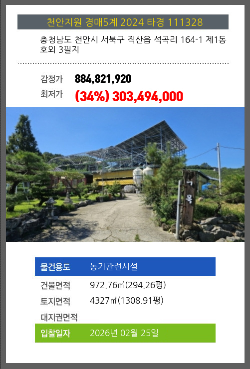 사건번호 2024 타경 111328 본건은 충청남도 천안시 서북구 직산읍 석곡리 164-1 제1동호외 3필지소재하는 농가관련시설경매 물건의 포스팅입니다. 건물면적 [ 972.76㎡ (294.26평) ]토지면적 [ 4327㎡ (1308.91평) ]
