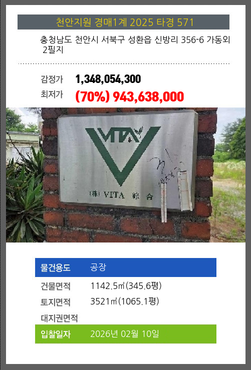 사건번호 2025 타경 571 본건은 충청남도 천안시 서북구 성환읍 신방리 356-6 가동외 2필지소재하는 공장경매 물건의 포스팅입니다. 건물면적 [ 1142.5㎡ (345.6평) ]토지면적 [ 3521㎡ (1065.1평) ]