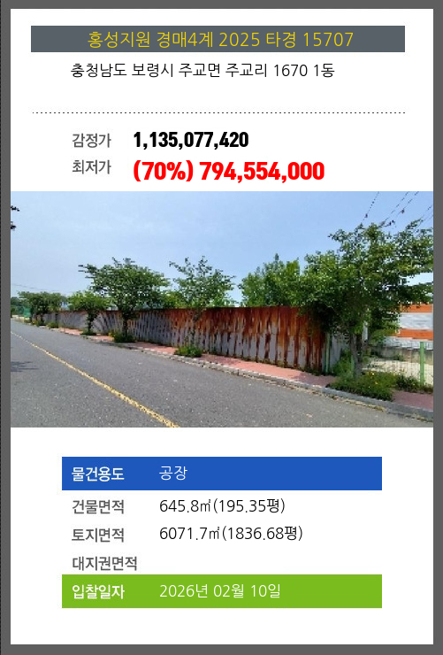 사건번호 2025 타경 15707 본건은 충청남도 보령시 주교면 주교리 1670 1동소재하는 공장경매 물건의 포스팅입니다. 건물면적 [ 645.8㎡ (195.35평) ]토지면적 [ 6071.7㎡ (1836.68평) ] 시세를 반영한