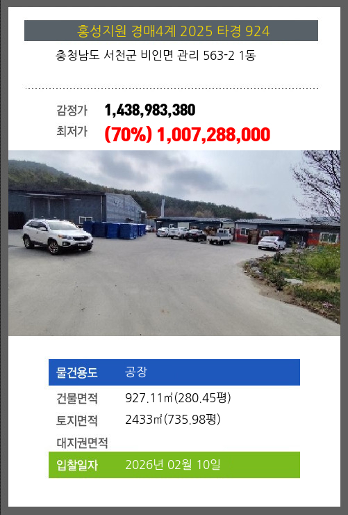 사건번호 2025 타경 924 본건은 충청남도 서천군 비인면 관리 563-2 1동소재하는 공장경매 물건의 포스팅입니다. 건물면적 [ 927.11㎡ (280.45평) ]토지면적 [ 2433㎡ (735.98평) ] 시세를 반영한