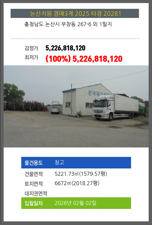사건번호 2025 타경 20281 본건은 충청남도 논산시 부창동 267-6 외 1필지소재하는 창고경매 물건의 포스팅입니다. 건물면적 [ 5221.73㎡ (1579.57평) ]토지면적 [ 6672㎡ (2018.27평) ] 시세를 반영한