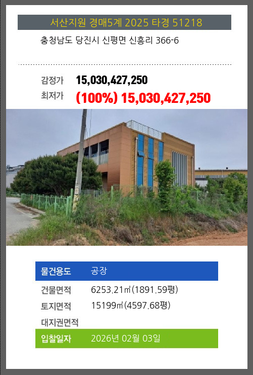 사건번호 2025 타경 51218 본건은 충청남도 당진시 신평면 신흥리 366-6소재하는 공장경매 물건의 포스팅입니다. 건물면적 [ 6253.21㎡ (1891.59평) ]토지면적 [ 15199㎡ (4597.68평) ] 시세를 반영한 감정가