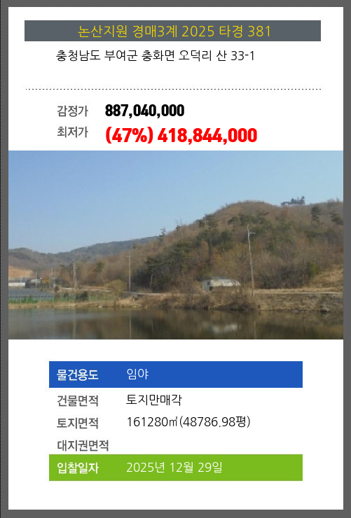 사건번호 2025 타경 381 본건은 충청남도 부여군 충화면 오덕리 산 33-1소재하는 임야경매 물건의 포스팅입니다. 건물면적 [ 토지만매각 ]토지면적 [ 161280㎡ (48786.98평) ] 시세를 반영한 감정가