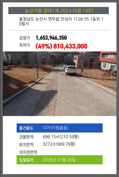 사건번호 2024 타경 1497 본건은 충청남도 논산시 연무읍 안심리 1126-35 1동외 10필지소재하는 다가구(원룸등)경매 물건의 포스팅입니다. 건물면적 [ 696.15㎡ (210.58평) ]토지면적 [ 3272㎡ (989.78평) ] 시세를