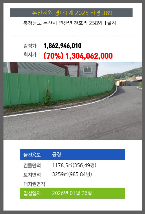 사건번호 2025 타경 389 본건은 충청남도 논산시 연산면 천호리 258외 1필지소재하는 공장경매 물건의 포스팅입니다. 건물면적 [ 1178.5㎡ (356.49평) ]토지면적 [ 3259㎡ (985.84평) ] 시세를 반영한