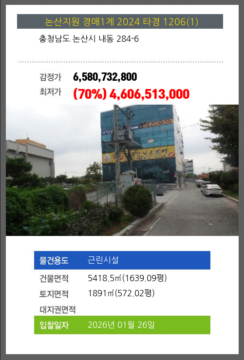 사건번호 2024 타경 1206(1) 본건은 충청남도 논산시 내동 284-6소재하는 근린시설경매 물건의 포스팅입니다. 건물면적 [ 5418.5㎡ (1639.09평) ]토지면적 [ 1891㎡ (572.02평) ] 시세를 반영한 감정가 6,580,732,800에서1회
