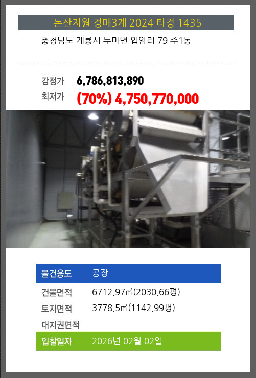 사건번호 2024 타경 1435 본건은 충청남도 계룡시 두마면 입암리 79 주1동소재하는 공장경매 물건의 포스팅입니다. 건물면적 [ 6712.97㎡ (2030.66평) ]토지면적 [ 3778.5㎡ (1142.99평) ] 시세를 반영한