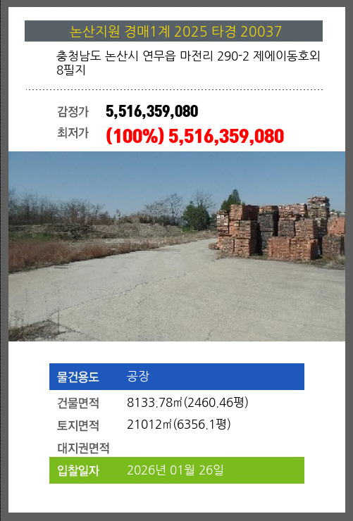 사건번호 2025 타경 20037 본건은 충청남도 논산시 연무읍 마전리 290-2 제에이동호외 8필지소재하는 공장경매 물건의 포스팅입니다. 건물면적 [ 8133.78㎡ (2460.46평) ]토지면적 [ 21012㎡ (6356.1평) ] 시세를