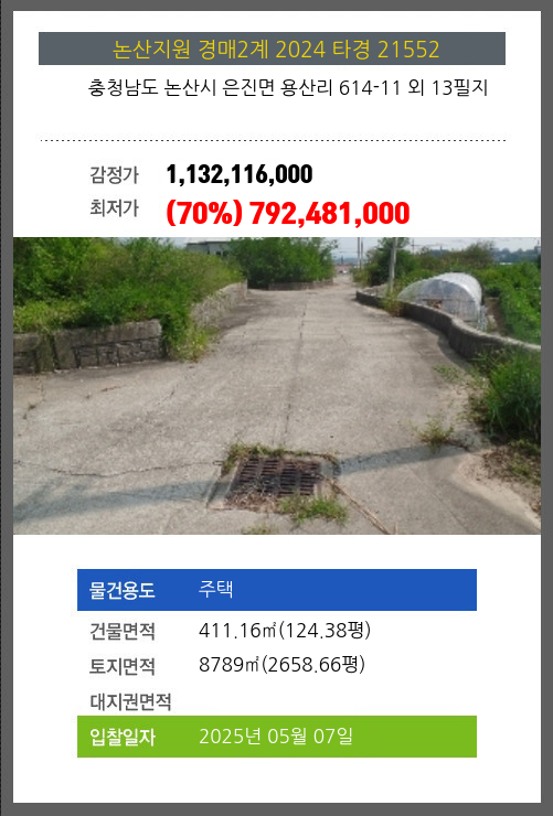사건번호 2024 타경 21552 본건은 충청남도 논산시 은진면 용산리 614-11 외 13필지소재하는 주택경매 물건의 포스팅입니다. 건물면적 [ 411.16㎡ (124.38평) ]토지면적 [ 8789㎡ (2658.66평) ] 시세를
