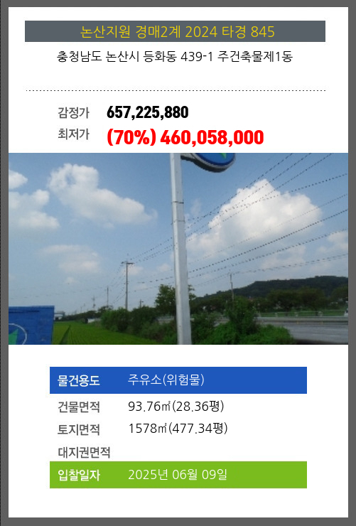사건번호 2024 타경 845 본건은 충청남도 논산시 등화동 439-1 주건축물제1동소재하는 주유소(위험물)경매 물건의 포스팅입니다. 건물면적 [ 93.76㎡ (28.36평) ]토지면적 [ 1578㎡ (477.34평) ] 시세를 반영한 감정가