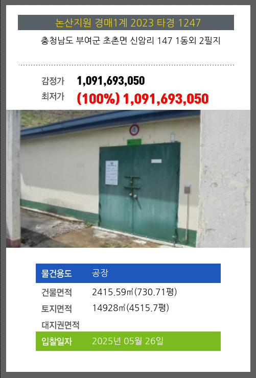 사건번호 2023 타경 1247 본건은 충청남도 부여군 초촌면 신암리 147 1동외 2필지소재하는 공장경매 물건의 포스팅입니다. 건물면적 [ 2415.59㎡ (730.71평) ]토지면적 [ 14928㎡ (4515.7평) ] 시세를