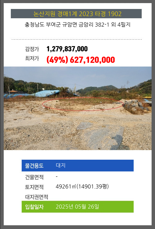 사건번호 2023 타경 1902 본건은 충청남도 부여군 규암면 금암리 382-1 외 4필지소재하는 대지경매 물건의 포스팅입니다. 토지면적 [ 49261㎡ (14901.39평) ] 시세를 반영한 감정가 1,279,837,000에서2회 유찰되어