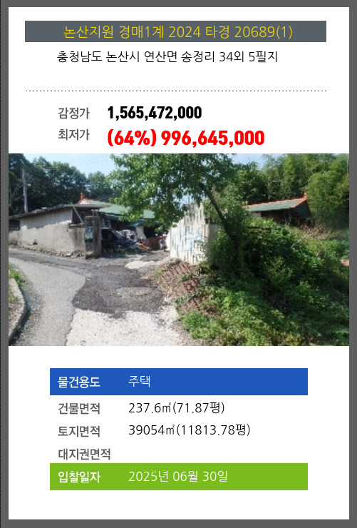 사건번호 2024 타경 20689(1) 본건은 충청남도 논산시 연산면 송정리 34외 5필지소재하는 주택경매 물건의 포스팅입니다. 건물면적 [ 237.6㎡ (71.87평) ]토지면적 [ 39054㎡ (11813.78평) ] 시세를 반영한