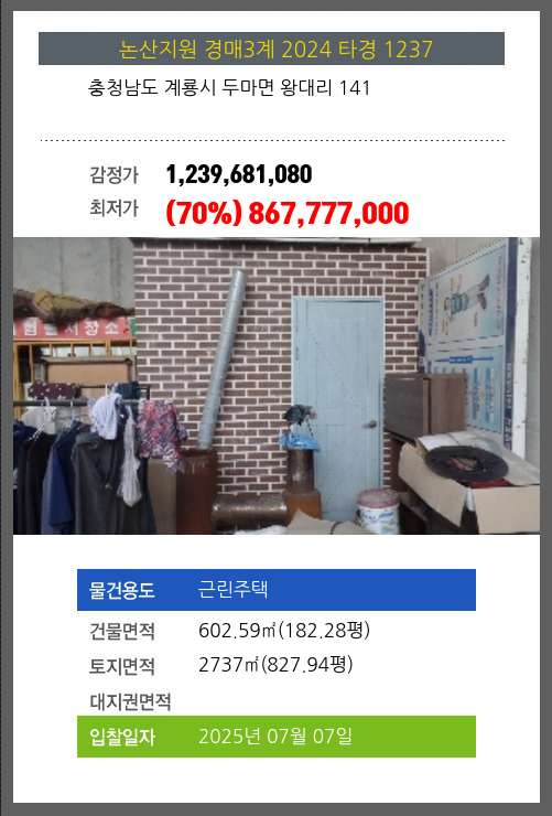 사건번호 2024 타경 1237 본건은 충청남도 계룡시 두마면 왕대리 141소재하는 근린주택경매 물건의 포스팅입니다. 건물면적 [ 602.59㎡ (182.28평) ]토지면적 [ 2737㎡ (827.94평) ] 시세를 반영한 감정가