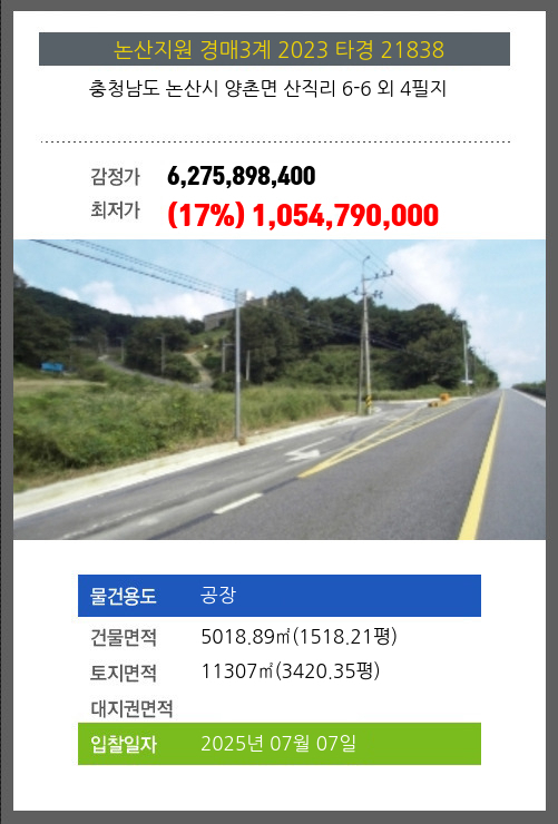 사건번호 2023 타경 21838 본건은 충청남도 논산시 양촌면 산직리 6-6 외 4필지소재하는 공장경매 물건의 포스팅입니다. 건물면적 [ 5018.89㎡ (1518.21평) ]토지면적 [ 11307㎡ (3420.35평) ] 시세를