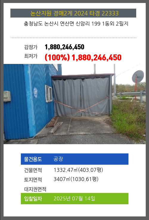 사건번호 2024 타경 22333 본건은 충청남도 논산시 연산면 신암리 199 1동외 2필지소재하는 공장경매 물건의 포스팅입니다. 건물면적 [ 1332.47㎡ (403.07평) ]토지면적 [ 3407㎡ (1030.61평) ] 시세를