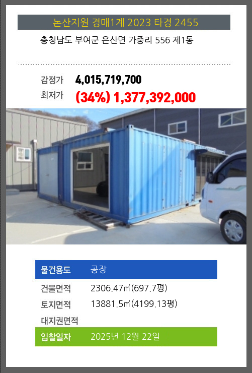 사건번호 2023 타경 2455 본건은 충청남도 부여군 은산면 가중리 556 제1동소재하는 공장경매 물건의 포스팅입니다. 건물면적 [ 2306.47㎡ (697.7평) ]토지면적 [ 13881.5㎡ (4199.13평) ] 시세를 반영한