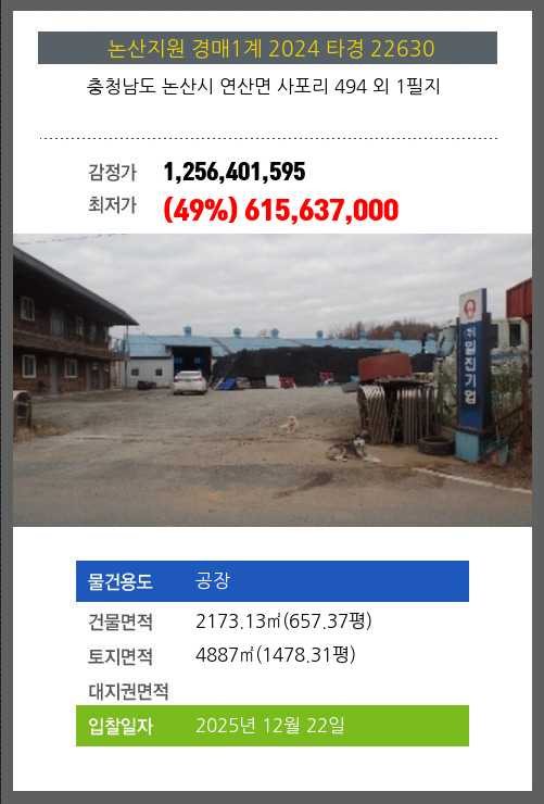 사건번호 2024 타경 22630 본건은 충청남도 논산시 연산면 사포리 494 외 1필지소재하는 공장경매 물건의 포스팅입니다. 건물면적 [ 2173.13㎡ (657.37평) ]토지면적 [ 4887㎡ (1478.31평) ] 시세를