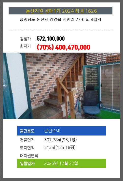 사건번호 2024 타경 1626 본건은 충청남도 논산시 강경읍 염천리 27-6 외 4필지소재하는 근린주택경매 물건의 포스팅입니다. 건물면적 [ 307.78㎡ (93.1평) ]토지면적 [ 513㎡ (155.18평) ] 시세를
