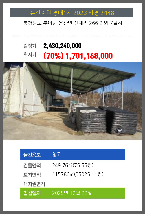 사건번호 2023 타경 2448 본건은 충청남도 부여군 은산면 신대리 266-2 외 7필지소재하는 창고경매 물건의 포스팅입니다. 건물면적 [ 249.76㎡ (75.55평) ]토지면적 [ 115786㎡ (35025.11평) ] 시세를