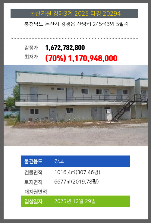 사건번호 2025 타경 20294 본건은 충청남도 논산시 강경읍 산양리 245-43외 5필지소재하는 창고경매 물건의 포스팅입니다. 건물면적 [ 1016.4㎡ (307.46평) ]토지면적 [ 6677㎡ (2019.78평) ] 시세를 반영한