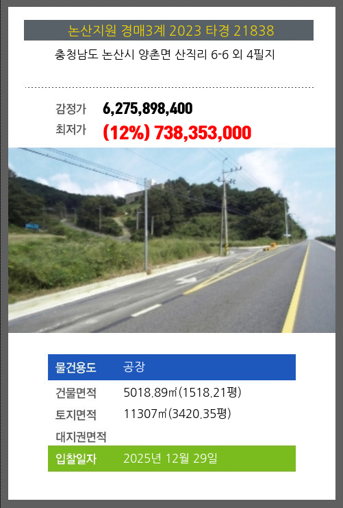 사건번호 2023 타경 21838 본건은 충청남도 논산시 양촌면 산직리 6-6 외 4필지소재하는 공장경매 물건의 포스팅입니다. 건물면적 [ 5018.89㎡ (1518.21평) ]토지면적 [ 11307㎡ (3420.35평) ] 시세를