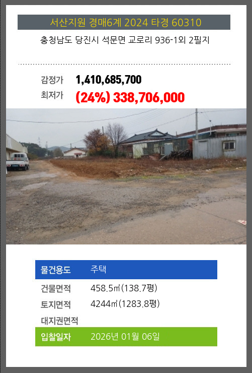 사건번호 2024 타경 60310 본건은 충청남도 당진시 석문면 교로리 936-1외 2필지소재하는 주택경매 물건의 포스팅입니다. 건물면적 [ 458.5㎡ (138.7평) ]토지면적 [ 4244㎡ (1283.8평) ] 시세를 반영한