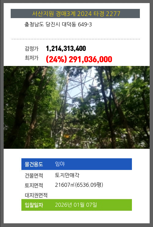 사건번호 2024 타경 2277 본건은 충청남도 당진시 대덕동 649-3소재하는 임야경매 물건의 포스팅입니다. 건물면적 [ 토지만매각 ]토지면적 [ 21607㎡ (6536.09평) ] 시세를 반영한 감정가 1,214,313,400에서4회 유찰되어