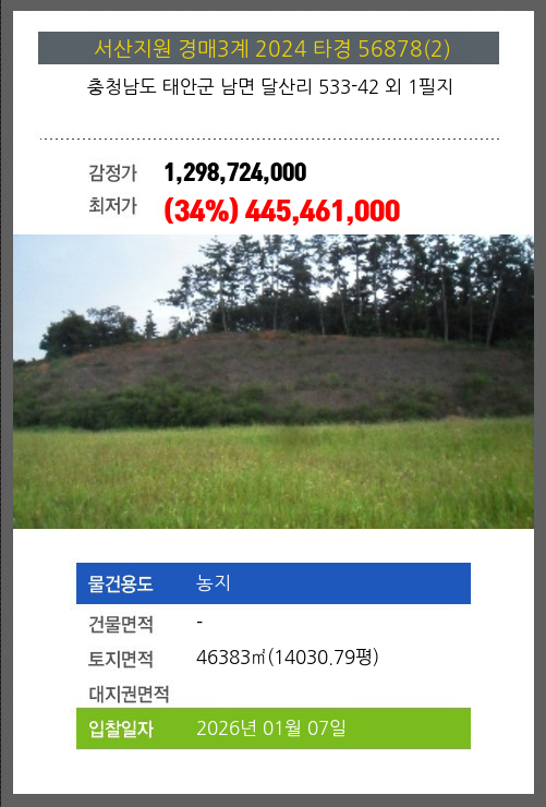 사건번호 2024 타경 56878(2) 본건은 충청남도 태안군 남면 달산리 533-42 외 1필지소재하는 농지경매 물건의 포스팅입니다. 토지면적 [ 46383㎡ (14030.79평) ] 시세를 반영한 감정가 1,298,724,000에서3회 유찰되어