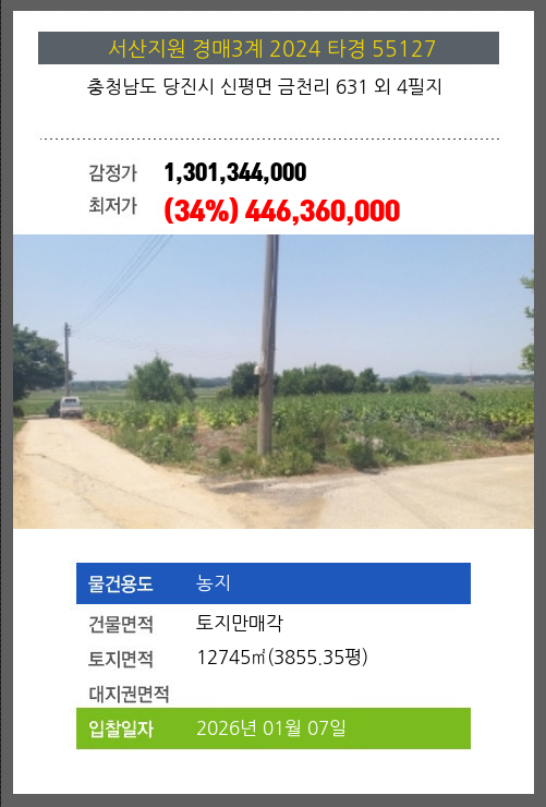 사건번호 2024 타경 55127 본건은 충청남도 당진시 신평면 금천리 631 외 4필지소재하는 농지경매 물건의 포스팅입니다. 건물면적 [ 토지만매각 ]토지면적 [ 12745㎡ (3855.35평) ] 시세를 반영한
