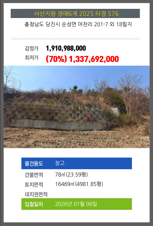 사건번호 2025 타경 576 본건은 충청남도 당진시 순성면 아찬리 201-7 외 18필지소재하는 창고경매 물건의 포스팅입니다. 건물면적 [ 78㎡ (23.59평) ]토지면적 [ 16469㎡ (4981.85평) ] 시세를