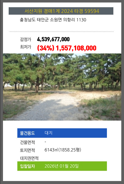 사건번호 2024 타경 59594 본건은 충청남도 태안군 소원면 의항리 1130소재하는 대지경매 물건의 포스팅입니다. 토지면적 [ 6143㎡ (1858.25평) ] 시세를 반영한 감정가 4,539,677,000에서3회 유찰되어 감정가 대비