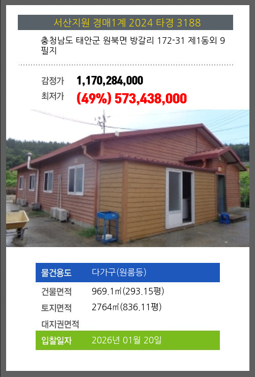 사건번호 2024 타경 3188 본건은 충청남도 태안군 원북면 방갈리 172-31 제1동외 9필지소재하는 다가구(원룸등)경매 물건의 포스팅입니다. 건물면적 [ 969.1㎡ (293.15평) ]토지면적 [ 2764㎡ (836.11평) ] 시세를