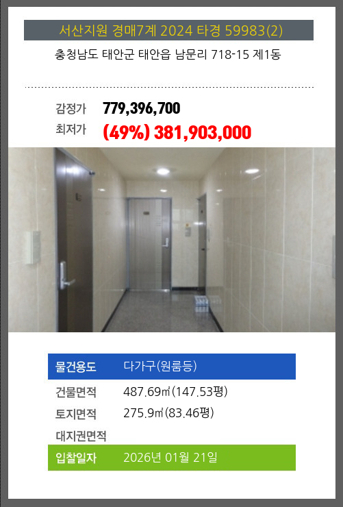 사건번호 2024 타경 59983(2) 본건은 충청남도 태안군 태안읍 남문리 718-15 제1동소재하는 다가구(원룸등)경매 물건의 포스팅입니다. 건물면적 [ 487.69㎡ (147.53평) ]토지면적 [ 275.9㎡ (83.46평) ] 시세를 반영한