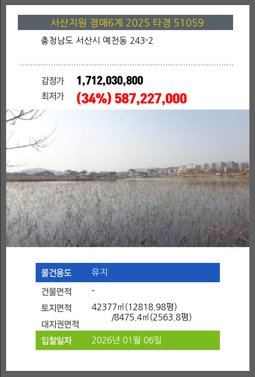 사건번호 2025 타경 51059 본건은 충청남도 서산시 예천동 243-2소재하는 유지경매 물건의 포스팅입니다. 토지면적 [ 전체:42377㎡ (12818.98평) 매각지분:8475.4㎡ (2563.8평) ] 시세를 반영한 감정가 1,712,030,800에서3회 유찰되어 감정가