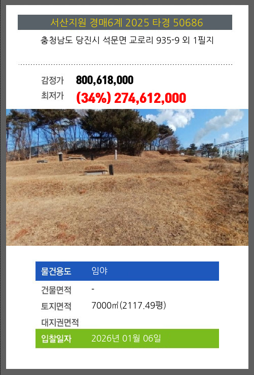사건번호 2025 타경 50686 본건은 충청남도 당진시 석문면 교로리 935-9 외 1필지소재하는 임야경매 물건의 포스팅입니다. 토지면적 [ 7000㎡ (2117.49평) ] 시세를 반영한 감정가 800,618,000에서3회 유찰되어