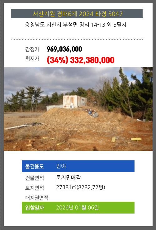 사건번호 2024 타경 5047 본건은 충청남도 서산시 부석면 창리 14-13 외 5필지소재하는 임야경매 물건의 포스팅입니다. 건물면적 [ 토지만매각 ]토지면적 [ 27381㎡ (8282.72평) ] 시세를 반영한